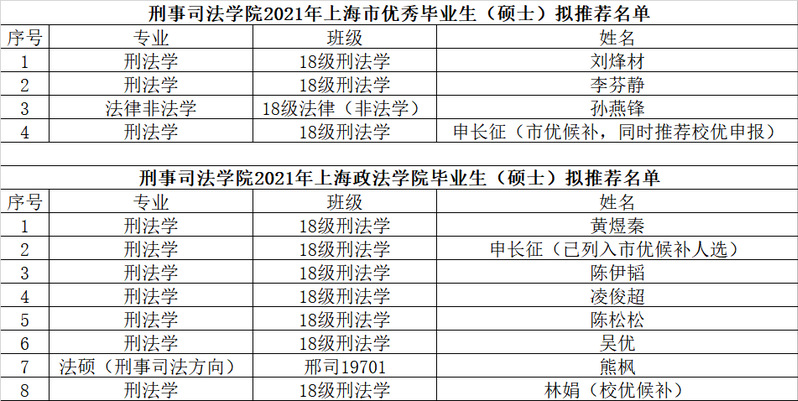 1. 上海市优秀毕业生,我院研究生名额为3人、候补1人,候补人员为18级刑法学申长征(已列入市优候补人选,同时推荐校优申报)。