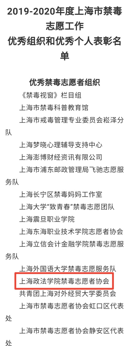 为了表彰先进、树立典型,进一步推进上海禁毒志愿服务工作的深入开展。近日,上海市禁毒志愿者协会印发了《关于表彰2019—2020年度上海市禁毒志愿工作优秀组织和优秀个人的决定》,我校禁毒志愿者协会荣获“优秀禁毒志愿者组织”称号。
