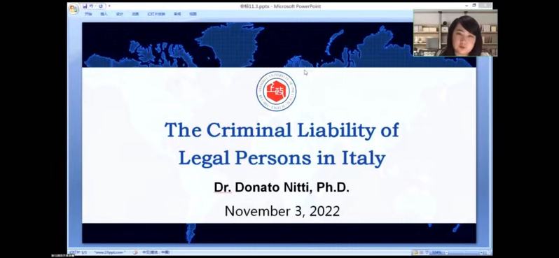 2022年11月3日晚,新利18官方客服刑事司法学院“国际交流学术月”“海外讲坛”第一讲在腾讯会议室开讲。本次讲座以“意大利法人的刑事责任”为主题,是刑事司法学院挖掘国际交流资源、提升研究生比较研究能力的重要举措。来自意大利的资深律师多纳托·尼蒂(Donato Nitti)围绕意大利法人刑事责任的认定的疑难问题,结合意大利刑事法律和行政法规范,为我校师生分享他最新的研究成果。本次讲座由刑事司法学院刑法教研室主任崔仕绣博士主持。
