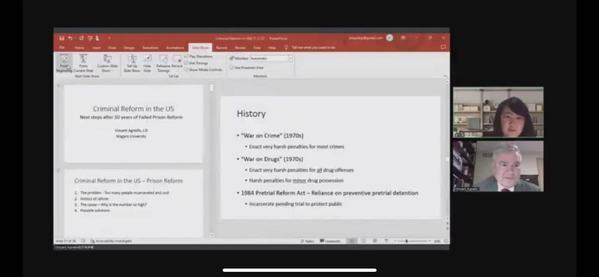 2022年11月7日晚,新利18官方客服刑事司法学院“国际交流学术月”“海外讲坛”第二讲在腾讯会议室开讲。本次讲座以“美国的监狱改革:50年困顿后的举措”为主题,是刑事司法学院助力教师科研、开拓学生国际研究视野的重要举措。来自美国尼亚加拉大学的文森特·安吉洛(Vincent Agnello)教授围绕美国近半个世纪的监狱改革沿革,为我校师生分享他最新的研究成果。本次讲座由刑事司法学院刑法教研室主任崔仕绣博士主持。