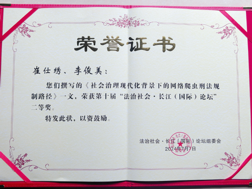 我校刑事司法学院刑法教研室主任崔仕绣博士及其研究生李俊美受邀参加此次论坛,并在分论坛三“犯罪治理现代化研究”作题为《社会治理现代化背景下的网络爬虫刑法规制路径》的主题报告。她们指出,网络空间安全治理是中国式社会治理现代化进程中无法回避的重要环节,针对网络爬虫的技术保护措施不足以保护数据安全,实践中网络爬虫行为符合诸多犯罪的行为要件,存在侵害多种法益的风险。对此,刑法作为维护社会秩序的保障法有必要进行规制,但须坚守刑法谦抑立场,保持数据安全与效率的平衡。刑法规制网络爬虫的路径,应围绕数据的访问权限与数据的开放程度对具体网络爬虫行为类型进行具体分析。对具有一般违法性的行为应当予以前置法规制。对具有刑事风险的行为,要进一步判断行为是否符合构成要件以及具有实质的法益侵害性,只有行为同时满足形式不法与实质不法的条件,刑法才有介入空间。经论坛组委会的初审和复审,本文荣获第十届法治社会·长江(国际)论坛“优秀论文二等奖”。