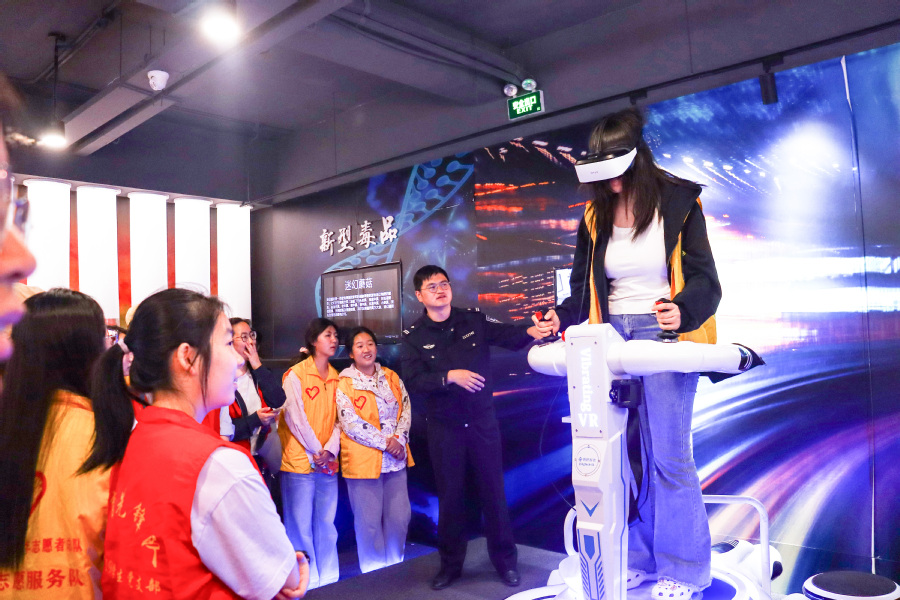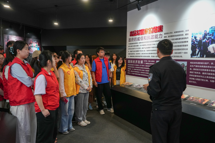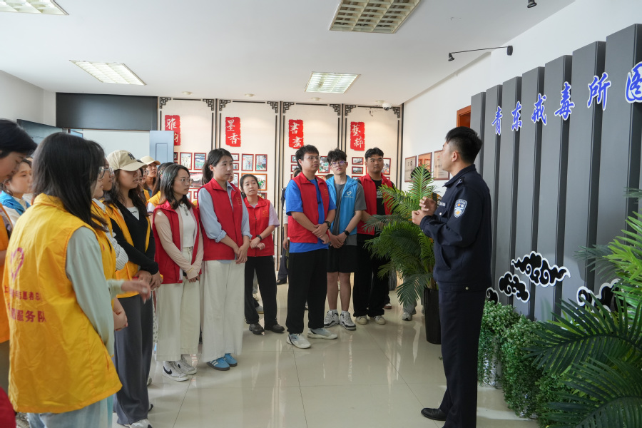 戒毒所民警向同学们详细介绍了青东强戒所的整体布局与建设历史,了解戒毒人员的管理模式、日常戒治流程及禁毒教育成果。在禁毒警示教育基地,志愿者们通过沉浸式体验,近距离观察等方式,了解了各类毒品发展历程及新型毒品种类。还通过虚拟现实技术亲身体验了在吸食毒品影响下的致幻情景,在今后的禁毒志愿宣传中能更为有力宣传毒品的危害性。