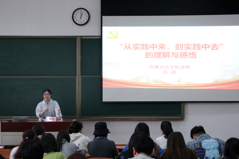 刑事司法学院青年教师段蓓为学员们作题为《“从实践中来,到实践中去”的理解与感悟》专题党课。她指出,“从实践中来,到实践中去”这一科学论断是我们党在长期革命、建设和改革实践中形成的宝贵经验结晶,是马克思主义认识论和实践观在中国的创造性运用和发展,是推动党和国家事业不断前进的重要法宝。段蓓通过分享个人的读书、科研经验,讲述毛泽东、王阳明等历史人物故事,将深刻理论与生动事迹相结合,深度剖析了“从实践中来,到实践中去”的科学内涵。她强调,实践与认知二者紧密相连、相辅相成,理论需经实践检验与完善,实践也需理论进行指引。在党课的最后,段蓓鼓励学员们要以此次党课为契机,进一步坚定理想信念,强化责任担当,善于从实践中发现问题、分析问题、解决问题,不断积累实践经验,提高实践能力。