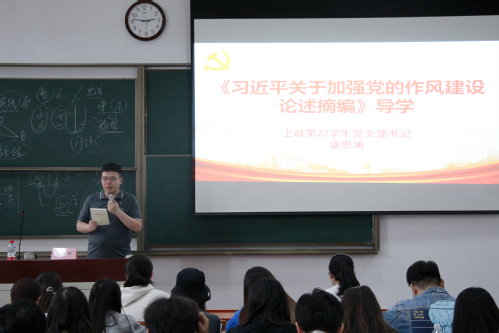 上政第22学生党支部书记盛思涵为学员们导学《习近平关于加强党的作风建设论述摘编》。在深刻回顾革命历史、感悟优良家风的基础上,盛思涵将重点聚焦在党的作风建设的现实要求上。他将红色革命精神、共产党员的优良家风以及中央八项规定三部分内容有机结合,层层递进、环环相扣,引导学员们深刻认识到加强党的作风建设的重要性和紧迫性。他号召学员们以革命先辈为镜,以“钉钉子精神”为引,始终铭记初心使命,将党的优良传统融入日常,做到政治坚定、知行合一,主动担当作为,把个人成长融入党和国家事业大局,以高度的政治责任感和使命感,争做作风优良、品德高尚的时代青年,以实际行动为党和人民的事业添砖加瓦。(撰稿、图片:刑事司法学院纪检监察学院党总支)