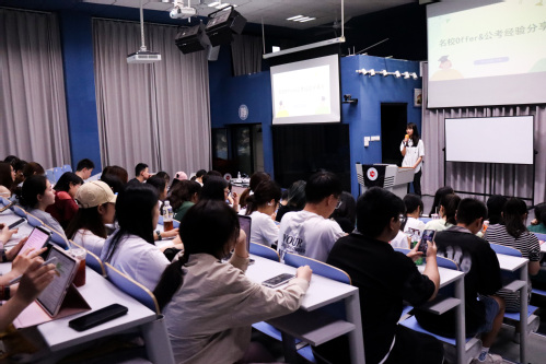 王珈程、李佳一分别围绕美国院校和英国院校做出国offer申请分享,重点介绍了美国顶尖法学院校的分级以及学位分类,从绩点、外语成绩、实习经历、竞赛荣誉等方面展开详细分享,在答疑环节,他们与同学们互动,回答了关于院校选择,留学费用以及项目选择的问题。活动现场气氛热烈,与会学生纷纷表示收获远超预期。