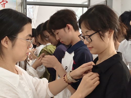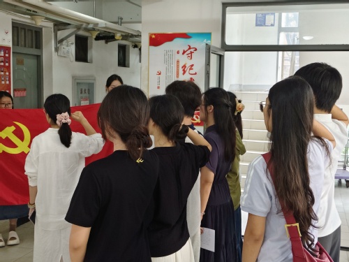 裘欣璐为新发展党员佩戴党员徽章并领誓。全体党员面向鲜红的党旗,神色肃穆、目光坚定,高举右拳进行庄严宣誓:“我志愿加入中国共产党,拥护党的纲领,遵守党的章程,履行党员义务,执行党的决定,严守党的纪律,保守党的秘密,对党忠诚,积极工作,为共产主义奋斗终身,随时准备为党和人民牺牲一切,永不叛党。”铿锵有力的誓言表达了对中国共产党的敬仰与忠诚。