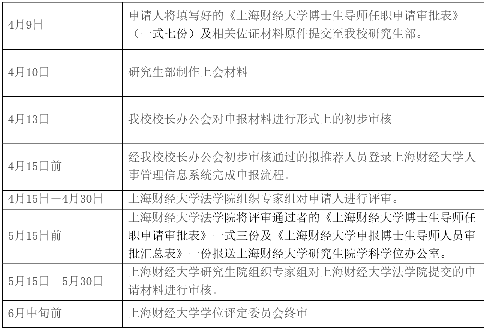 我校校长办公会将于4月13日对申报材料进行形式上的初步审核。审核通过后,将拟推荐名单及填写无误的《上海财经大学博士生导师任职申请审批表》报上海财经大学法学院。我校拟推荐教师务必于4月15日前登录上海财经大学人事管理信息系统完成申报流程。