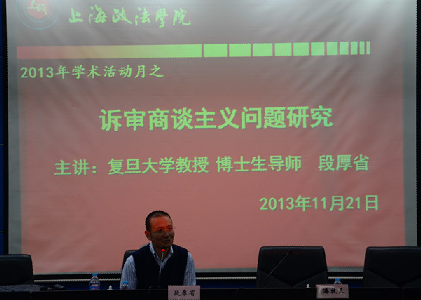 按照我校“第五届学术活动月”的统一安排,应研究生部邀请,11月21日下午,华东政法大学教授马长山教授、复旦大学段厚省教授来我校,在庸夫楼112报告厅作“‘国家主义’法治策略的问题与出路”和“诉审商谈主义问题研究”的学术讲座。讲座由研究生部主任潘牧天教授主持,法律学院部分教师、研究生部全体教师、2012级和2013级全体硕士研究生参加。