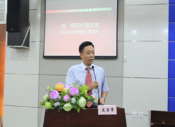 开学典礼由潘牧天副校长主持。他首先介绍了与会的领导和老师。在庄严的国歌声中,典礼拉开了序幕。2015级研究生新生张琳和胡珊同学分别代表法律硕士研究生和法学硕士研究生发言。他们承诺要珍惜在校的学习时光,积极思考、勇于实践,为成为一名合格的高级法律人才而努力,同时也为学校的建设增光添彩。接下来由研究生导师代表、经济法学院院长胡戎恩教授发言。胡教授的发言内容丰富,旁征博引。胡教授用风趣的语言告诫在座的研究生增强体质、努力拼搏,因为每个人都承载着家庭沉甸甸的期盼。他认为研究生阶段最重要的就是掌握科学的研究方法,学会独立思考,树立自由之精神。胡戎恩教授以张载的名言“为天地立心,为生民立命,为往圣继绝学,为万世开太平”结束了他的精彩发言。