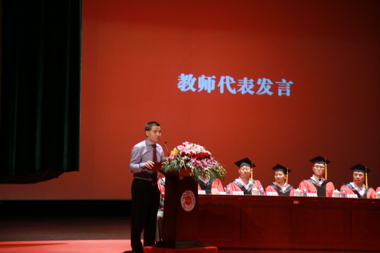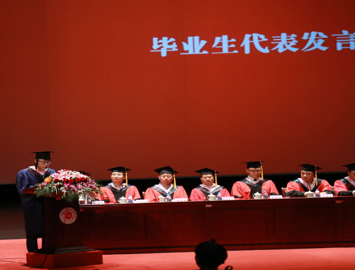 在雄壮的国歌中,典礼拉开帷幕。毕业生、校友和教师代表分别发言。我校2014级刑法学专业硕士毕业生代表马成功发言,他饱含深情地表达了对母校和老师们悉心栽培的感激之意,对研究生时光的恋恋不舍,以及对扬帆起航新生活的期待与向往。作为一名法学毕业生,他坚信法律的信仰需要双手来实现,建设法治中国,依靠的不是看客评论家,更不是表演家,而是一个个脚踏实地的建设者。