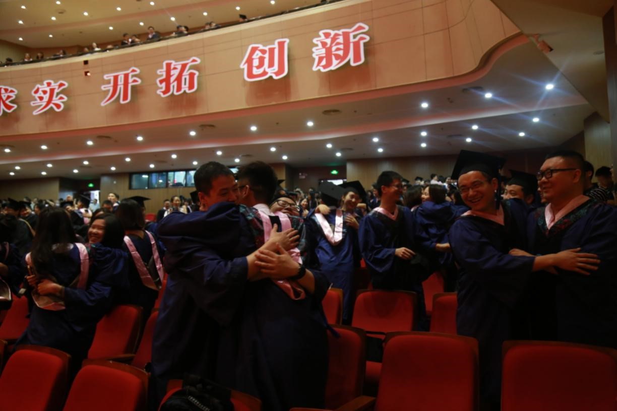 伴随着学位授予仪式的正式开始,毕业典礼达到了高潮。研究生处副处长刘英明宣读硕士毕业生名单,与会领导、老师为毕业生正冠、拨穗,祝贺他们用辛劳的汗水收获了今日的学业有成。毕业典礼在温情的感恩仪式中进入尾声,毕业生向家长和老师鞠躬,感恩父母悉心哺育,感谢老师谆谆教诲,并给同学一个拥抱,致敬友谊、相约未来。