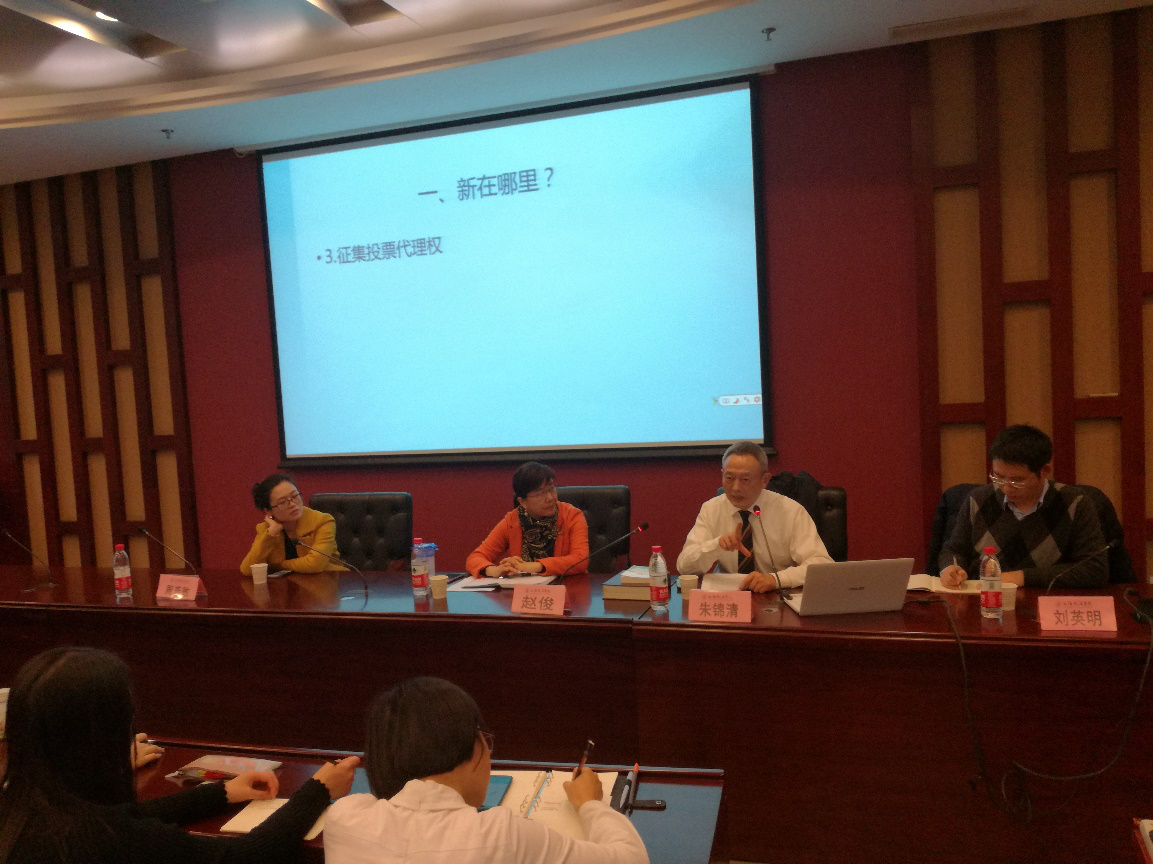 讲座伊始,朱锦清先生介绍了其新作《公司法学》的创新之处,如增加公司会计一章,对董事的注意义务和忠诚义务、派生诉讼、征集投票代理权、刺穿公司面纱与3+1标准、有限责任公司和上市公司的不同特点作全面准确的阐述等。朱锦清先生在书中引用了许多美国公司法上的经典案例以更加清楚地阐明公司法的要义。朱锦清先生表示,他新著的《公司法学》文字浅显、条理清晰、内容系统、体系完整;他希望这本书成为一本与国际先进水平全面接轨的公司法教材,也期望这本书对提高我国公司法的教学研究和审判水平有所帮助。