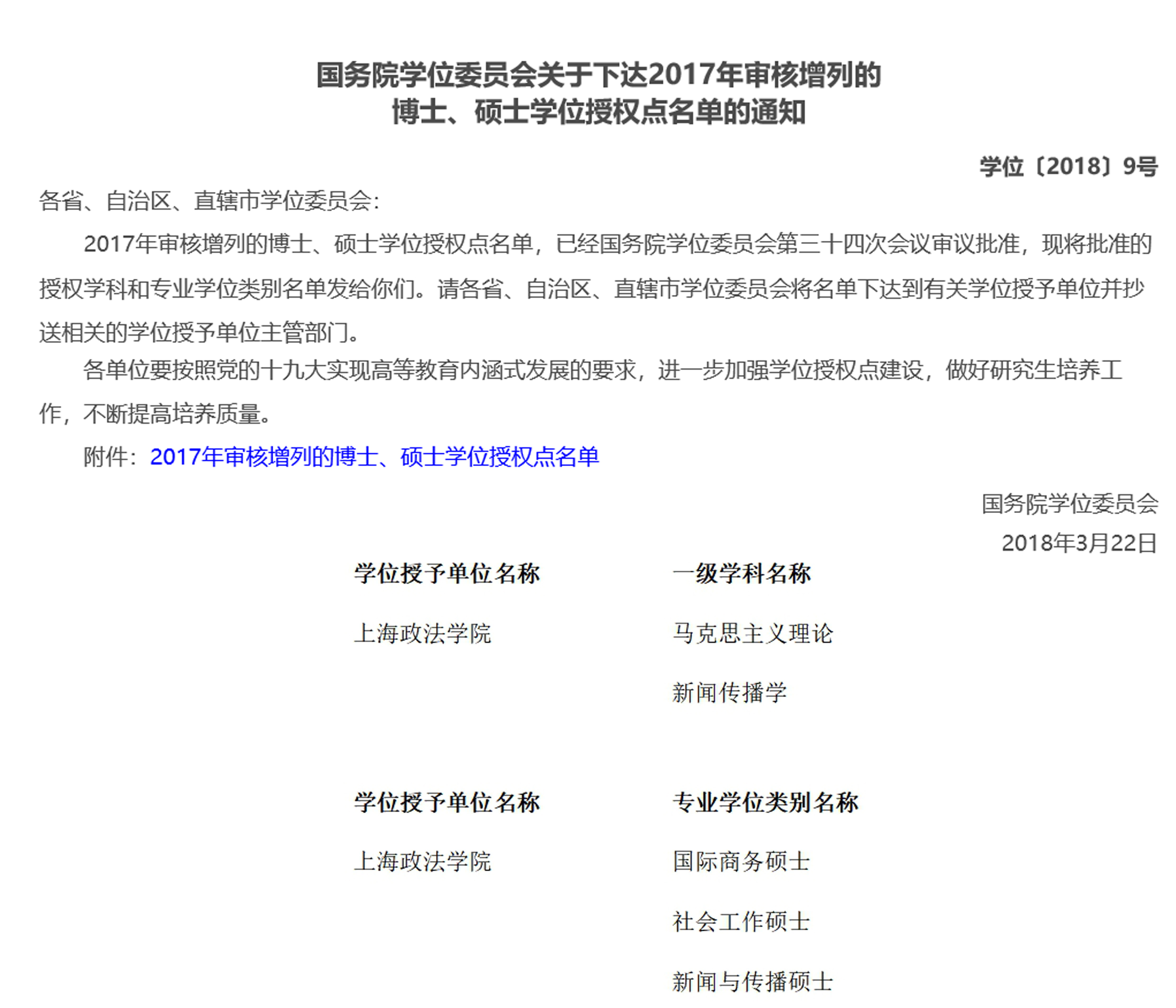 3月27日上午,国务院学位委员会正式印发《国务院学位委员会关于下达2017年审核增列的博士、硕士学位授权点名单的通知》(学位〔2018〕9号),公布了此次批准的新授权学科和专业学位类别名单,我校获批5个硕士学位授权点,其中一级学科硕士学位授权点两个,分别为0305马克思主义理论、0503新闻传播学;专业硕士学位授权点三个,分别为0254国际商务硕士、0352社会工作硕士、0552新闻与传播硕士。