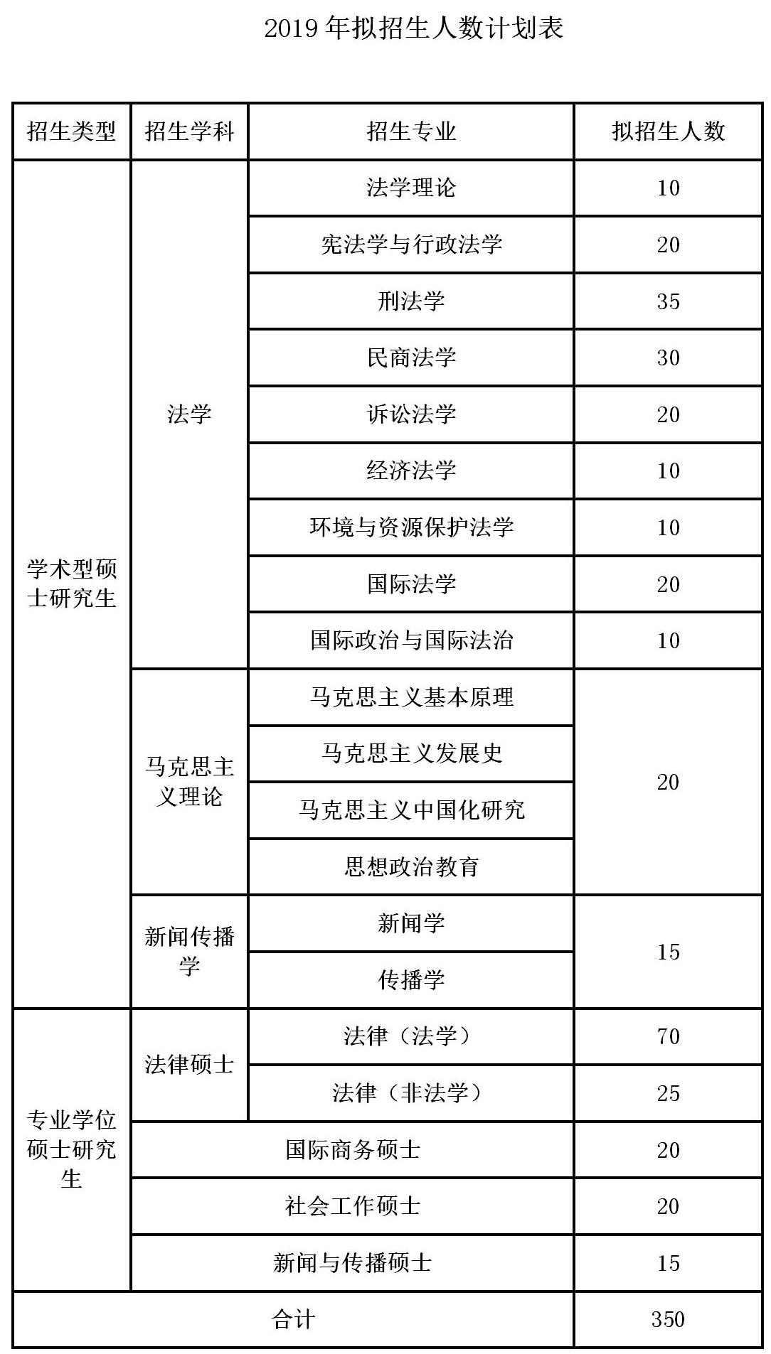 2019年我校拟招收硕士研究生约350名,其中学术型硕士研究生约200名,专业学位硕士研究生约150名,具体拟招生计划人数参见下表。法律硕士考生网上报名时需选报培养方向,参加我校复试可以再次明确。
