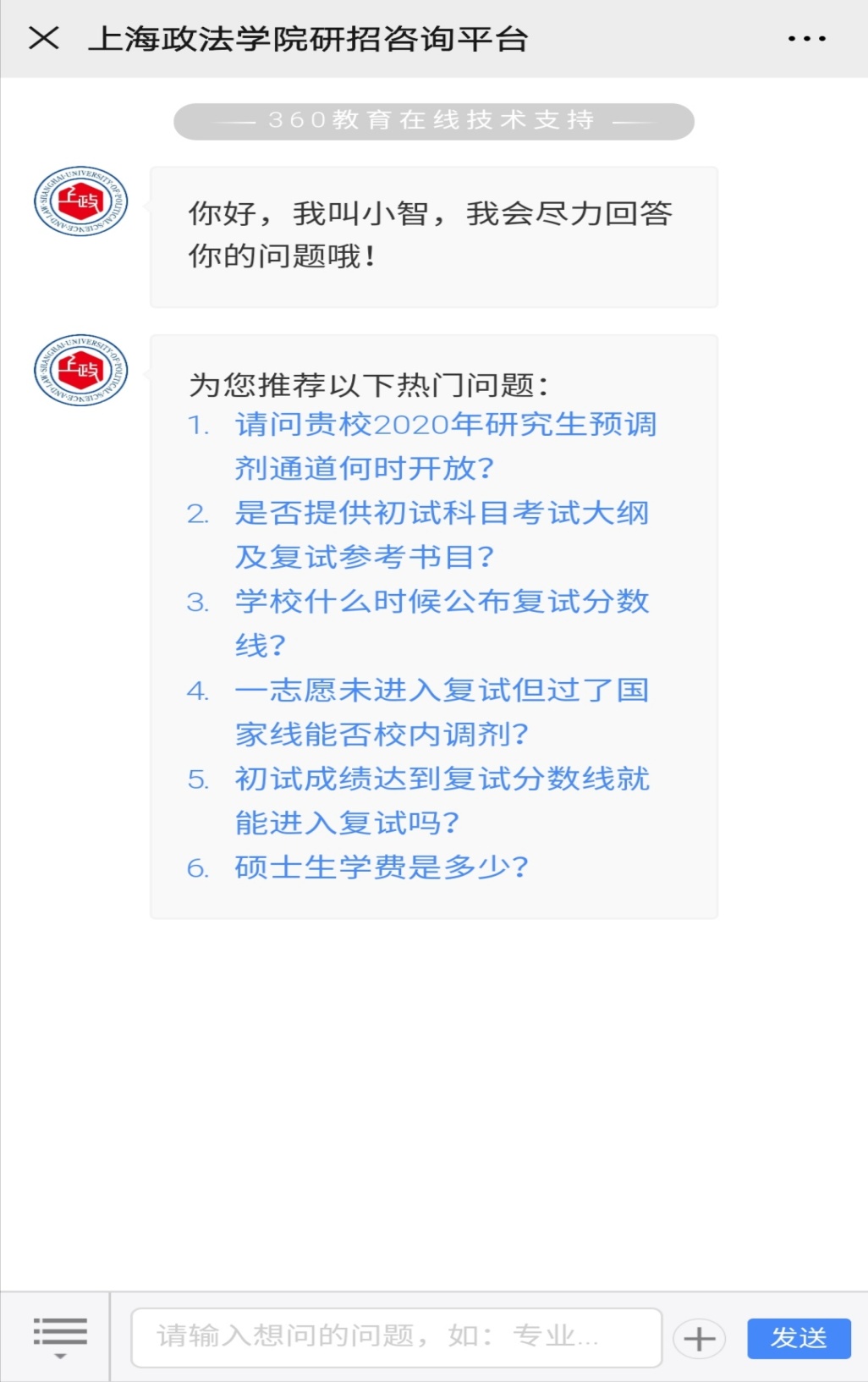 为及时解答考生疑问,我校设置“研招小智问答”咨询答疑。考生可在“上政研招”(SHUPLYJSZS)公众号右下角,点击报考指南,选择招生问答即可进入研招小智问答界面。小智问题系统内置了多种场景的提问和回答,对话框输入关键词即可检索常见问题,也可以直接向我校招办老师提问,我们会第一时间进行回复,请广大考生理解和支持学校在特殊时期的工作安排。