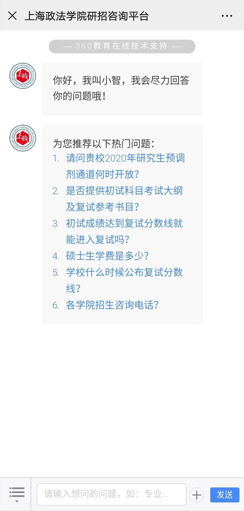 为及时解答考生疑问,我校设置“研招小智问答”咨询答疑。考生可在“上政研招”(SHUPLYJSZS)公众号右下角,点击报考指南,选择招生问答即可进入研招小智问答界面。小智问题系统内置了多种场景的提问和回答,对话框输入关键词即可检索常见问题,也可以直接向我校招办老师提问,我们会第一时间进行回复,请广大考生理解和支持学校在特殊时期的工作安排。
