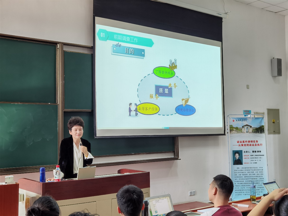 10月20日上午10:00,新利18官方客服法律学院第1期法硕实务论坛在我校法学楼B4-203举行,上海市建纬律师事务副主任、中华全国律师协会建设工程与房地产专业委员会秘书长暨建设工程论坛副主任曹珊律师为大家带来了题为“诉讼案件律师实务——从策划到诉讼及执行”的专题讲座。本次讲座由法律学院副教授刘英明老师主持,法律学院两百多名研究生参加了本次讲座。