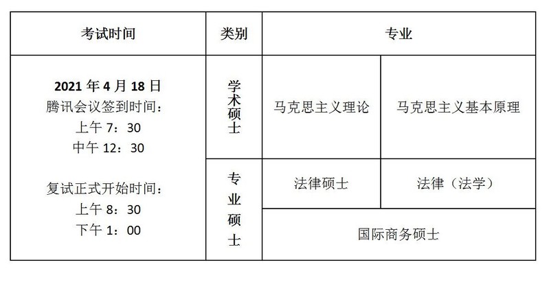 复试正式开始时间为当天上午8点30分、下午1点。复试考生的具体面试时间以考务人员通知为准,复试专业安排以下表为准: