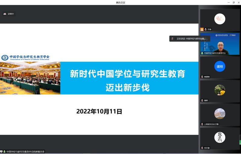 为进一步贯彻落实全国研究生教育会议重要精神,全面落实立德树人职责,引导研究生导师队伍坚持“四为”方针,增强新聘研究生导师进行科研指导、学术规范教育、心理辅导和就业指导等方面的能力和水平,10月11日下午,研究生处举办2022年度新聘任硕士研究生导师培训暨“四有导师学院”项目学习线上开班式。本次开班仪式由研究生处副处长卫磊主持,中国学位与研究生教育学会会长杨卫院士以录播方式主讲第一课,学会副秘书长沈岩、科研处负责人刘军教授发言,二十余名新聘导师共同参会。