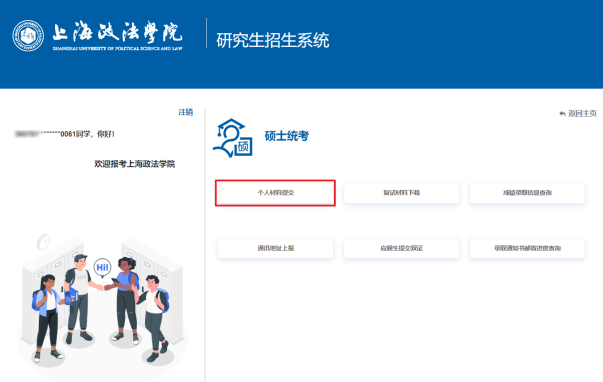 准予复试的考生可点击【硕士统考】功能菜单中的【个人材料提交】即可上传学校要求的个人材料,点击确定提交即可。