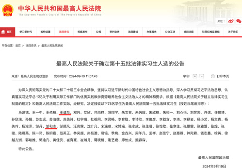 近日,最高人民法院公布了本批法律实习生名单。我校推荐的2023级民商法学硕士研究生邹和志和2023级法律硕士研究生王诚至入选。这是学校在该实习项目推荐上取得的新突破,体现了最高人民法院对学校教育质量的肯定,对促进院校双向交流、完善法治人才培养机制有着重要推动。后续学校将进一步深化与各级人民法院等实务部门交流协作,加强研究生课程建设,持续优化实习实践、人才培养与就业贯通机制。