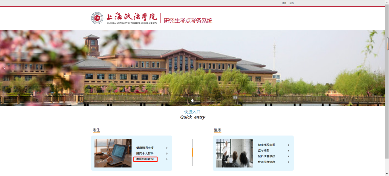 为方便本考点考生,考试当天顺利入场,考生可在2024年12月18日(明天)10:00起登录我校考点考务系统(https://yzkd.shupl.edu.cn/)查询本人考场信息并牢记。