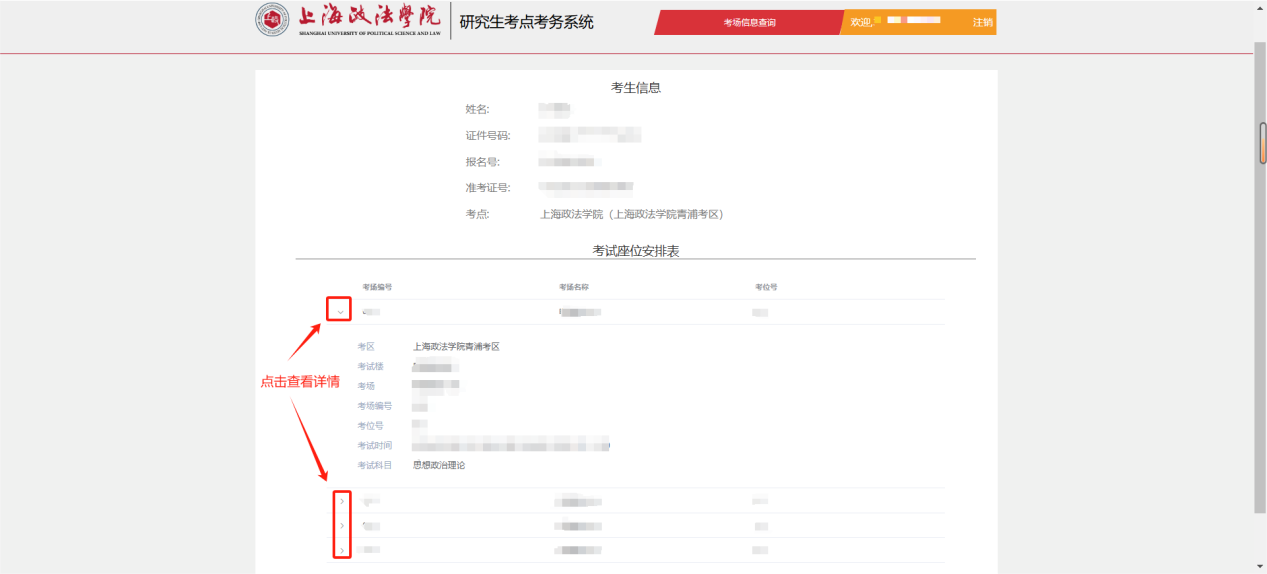 点击考生部分【考场信息查询】,即可进入界面查询本人基本信息及所在考场场次信息;点击左侧箭头,可查询该场次具体详情。