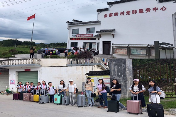 在项目指导老师潘婕的带领下,来自我校6个专业的7名志愿者和上海市松江区佘山外国语学校8位师生,乘坐近4个小时的高铁,1个多小时的汽车,终于安全顺利到达了此次支教目的地——金家岭村村委会,受到了当地村委会和村民的热情欢迎。