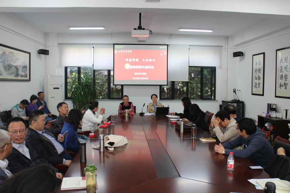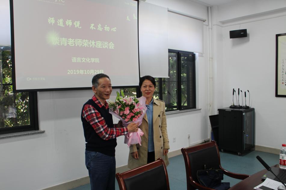 10月29日下午,语言文化学院在A1-101召开谈青老师荣休座谈会,学院全体教职工参加,党总支书记姚善英主持。
