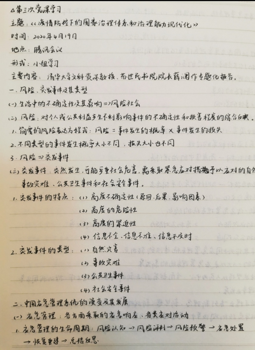 本次专题党课围绕“疫情防控下的国家治理体系和治理能力现代化”展开,介绍了习近平总书记考察调研清华大学新冠肺炎防控科研攻关工作的情况。党课从六个方面传达了习近平总书记关于疫情防控工作重要讲话和指示批示精神,讲授了风险、突发事件与应急管理的分类与内涵,梳理了我国应急管理系统的演变及发展,提出了新时期中国应急管理系统面临的挑战,并就如何推进中国应急管理系统和能力现代化作出解读。