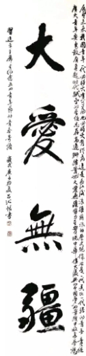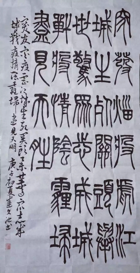 该作品是一幅篆书书法作品,内容节选自刘霞先生在疫情期间所创作的诗文《遇时疫有感》表达了该作品内容创作者和书法创作者对疫情发展的关心,对一线工作人员的支持以及对疫情早日结束共同迎来春暖花开胜利之时的期盼。