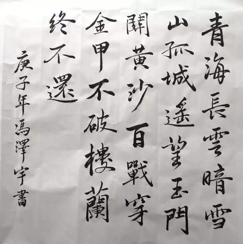 本作品的内容为王昌龄《从军行七首·其四》,诗歌的主要描述了青海湖上乌云密布,遮得连绵雪山一片黯淡。边塞古城,玉门雄关,远隔千里,遥遥相望。守边将士身经百战,铠甲磨穿,壮志不灭,不打败进犯之敌,誓不返回家乡。在抗击疫情的战役中,各位医护人员、警察等在一线无私奉献的英雄们,都是这场战役中身穿黄金战甲的战士。