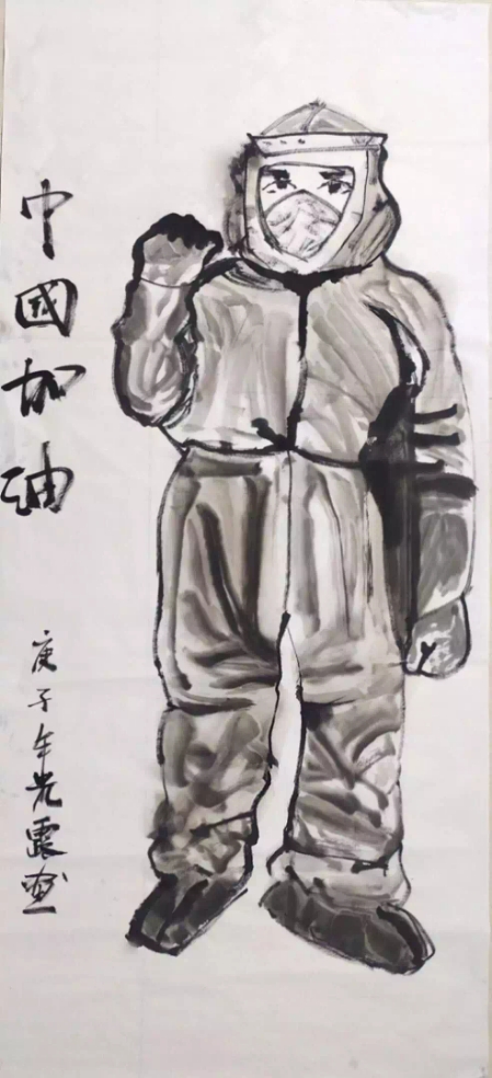 作品介绍:该作品画了一个身着防护服的医务人员。对着大家比出加油的手势。该医务人员神情严肃坚定,眼神充满希望,表达了抗疫的必胜决心和坚定信念。