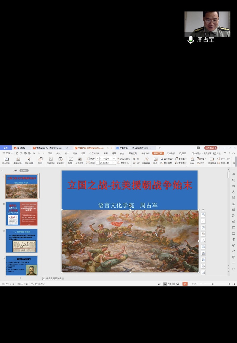 会上,外语专业教工党支部党员周占军为大家作了题为“立国之战——朝鲜战争始末”的“四史”学习教育微党课。党课围绕抗美援朝的意义、起因、爆发以及对世界局势的影响等方面详细展开,周老师声情并茂的讲解让大家身临其境,深切感受到了抗美援朝战争的重大历史意义和艰苦卓绝,激发了广大党员爱党爱国的情怀。