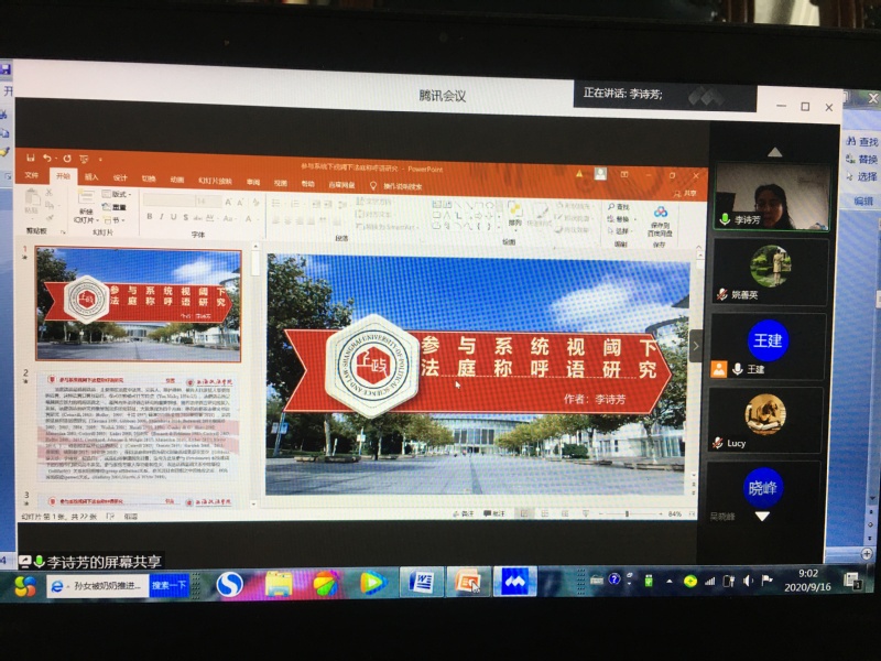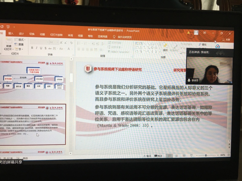 9月16日上午,我校语言文化学院李诗芳教授为西南政法大学外语学院师生作了题为“参与系统视阈下法庭称呼语研究”的云端学术讲座,西南政法大学外院近百名师生通过在线的方式参加了此次讲座。