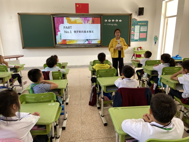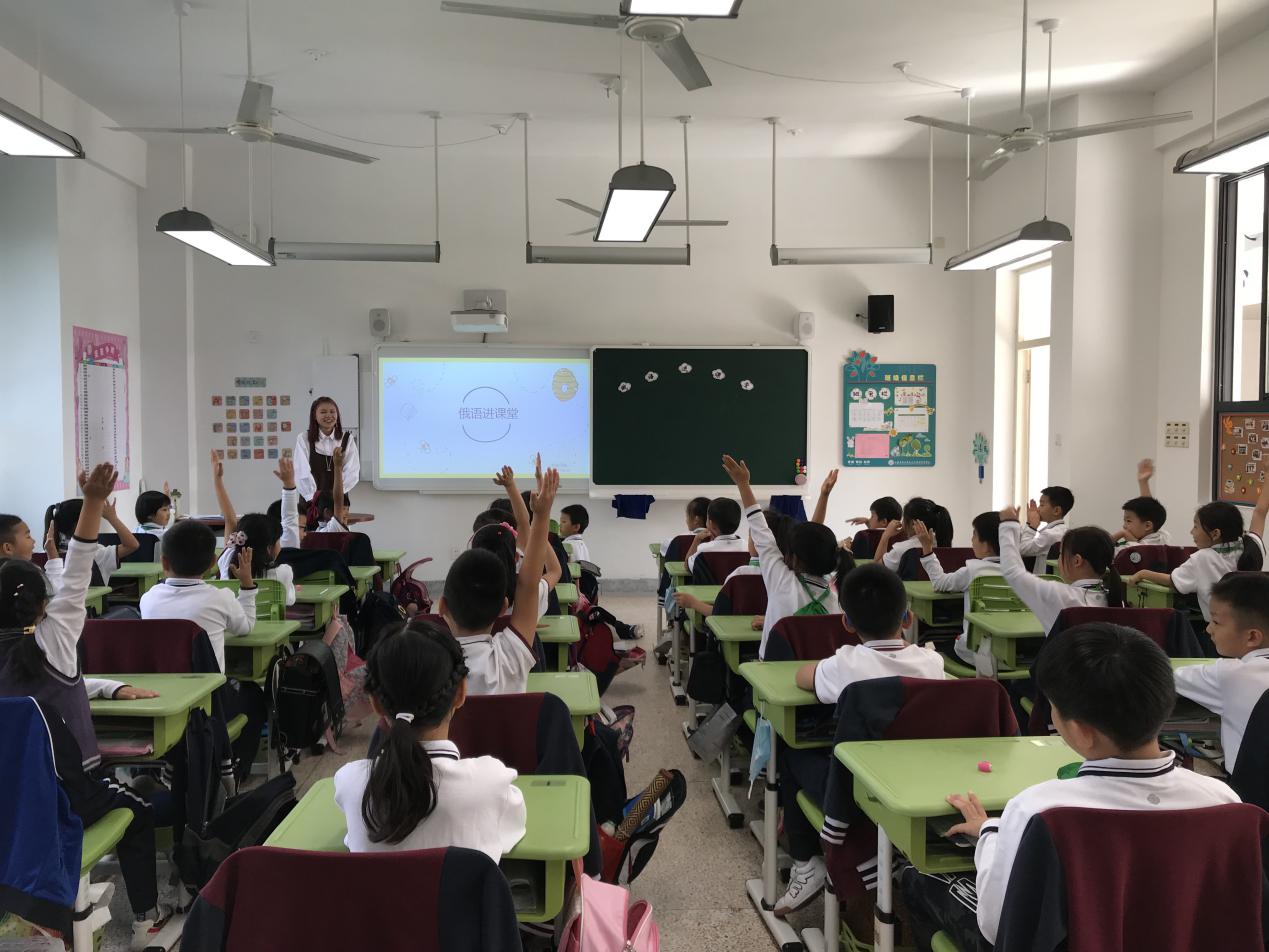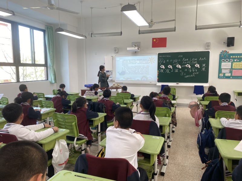 “俄语进课堂”项目面向佘外实验学校二三年级和六七年级的学生,语院组建了由10位俄语专业高年级学生担任课程教师的志愿者服务队。志愿者们每周两次来到实验学校教授基础俄语,教唱俄语字母歌、展示俄罗斯著名城市、讲述俄罗斯传统节日和习俗,志愿者教师们寓教于乐,孩子们乐在其中。俄语兴趣课为中小学生带来了全新的语言体验,从语言学习的字母、拼音、单词到说出基本会话用语的收获与欣喜,无不为孩子们的语言学习埋下了兴趣的种子,树立了学好语言服务国家建设的远大理想。