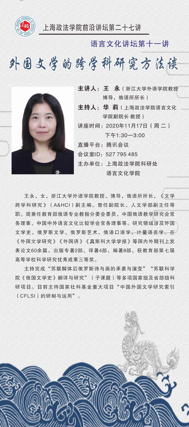 11月17日下午,语言文化学院举办新利18官方客服前沿讲坛第二十七讲暨语言文化讲坛第十一讲。浙江大学俄语所所长、博士生导师、教育部俄语专业教指分委会委员王永教授应邀为语言文化学院的师生作了题为“外国文学的跨学科研究方法谈”的云端讲座。本次讲坛由语言文化学院副院长华莉教授主持,有五十多名师生聆听了讲座。