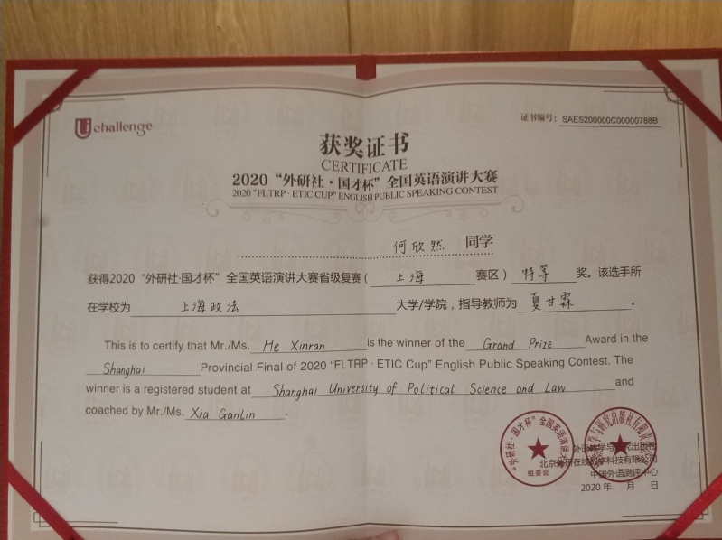 11月21日,2020“外研社-国才杯”全国英语演讲比赛上海赛区复赛于华东师范大学闵行校区隆重举行。本次比赛共有来自复旦大学,上海交通大学,同济大学,华东师范大学,上海外国语大学等多所高校的27名选手参与角逐。由我校语言文化学院夏甘霖老师指导的2017级英语专业何欣然同学代表我校参加比赛。在激烈的竞争中,何欣然同学表现出色,获得2020“外研社-国才杯”全国英语演讲比赛上海赛区复赛特等奖,并将与获得特等奖的另外两位选手共同代表上海市参加12月中旬于北京举行的全国总决赛。
