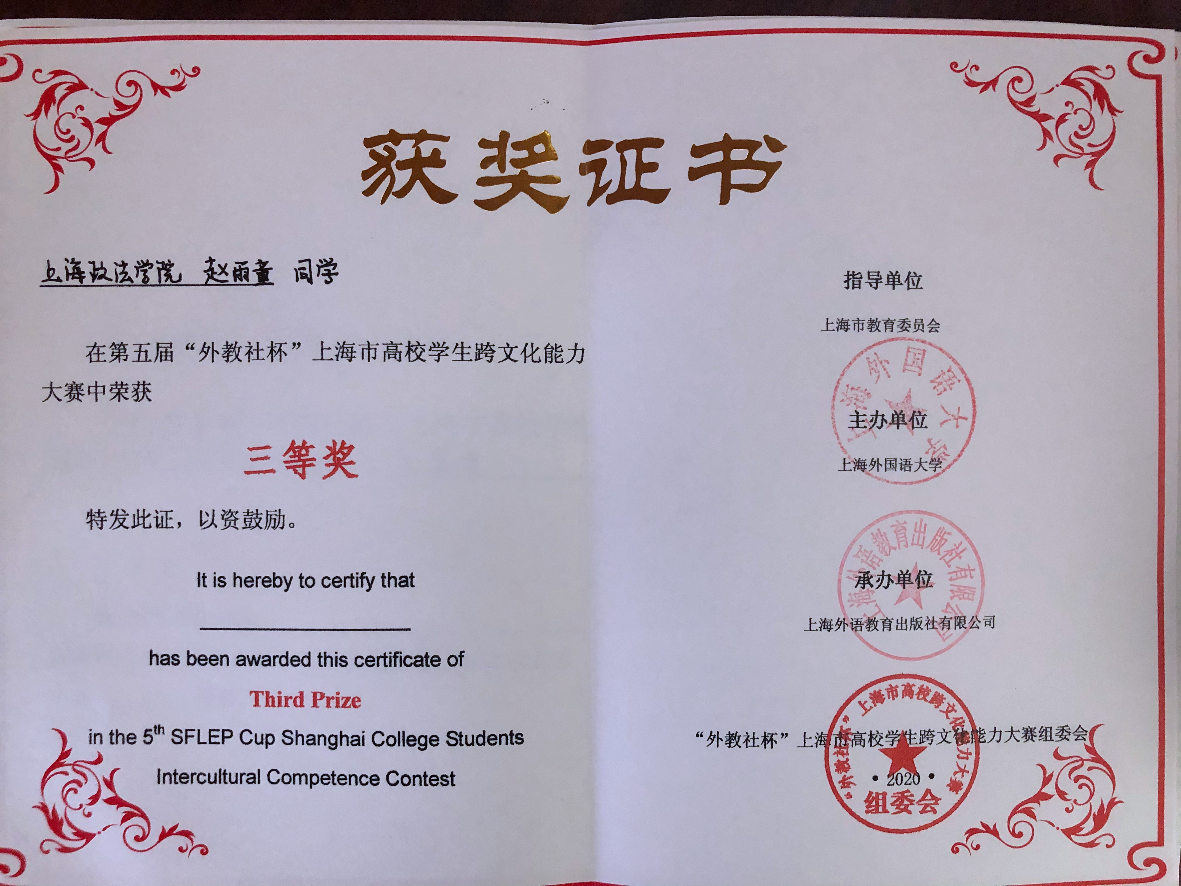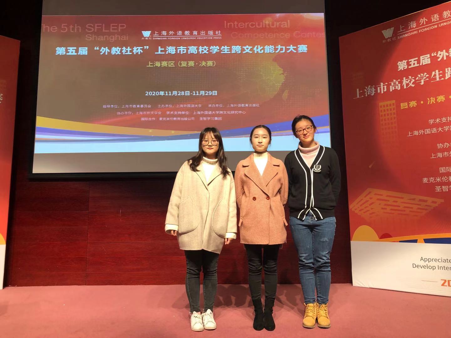 11月28-29日,第五届“外教社杯”上海市高校学生跨文化能力大赛在上海外语教育出版社落下帷幕,我校语言文化学院英语专业2019级宋思婕、赵雨童和2020级翻译专业袁心童三位同学代表我校参加本次大赛,获得三等奖,语言文化学院指导教师张静文获指导教师三等奖。