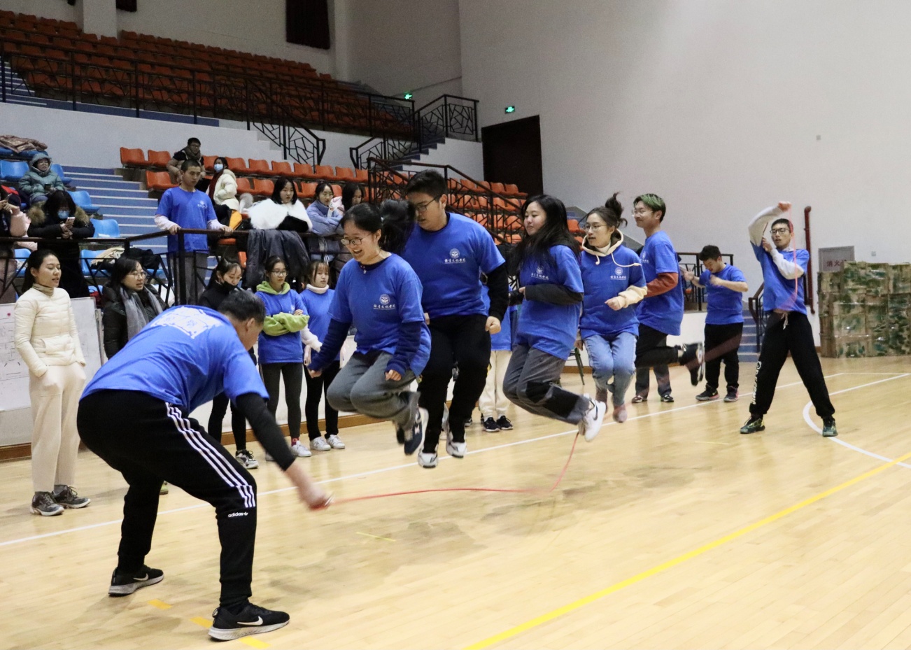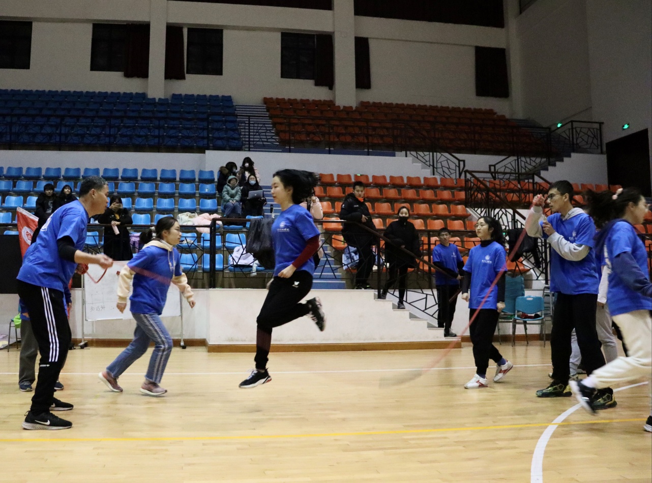 进入决胜赛第二轮的队伍将面临更具挑战性的赛制:跳绳队员分三组出场,每组五名队员需逐一进入、原地跳跃,逐步完成五人共同跳绳;比赛时长1分钟,以第五人进入后开始计数,跳绳次数多者获胜;以三组累计的成绩作为本轮成绩,成绩最差的队伍将被淘汰。在本轮比赛中,我院分别以37下、27下和42下(总成绩106下)的成绩惊险晋级,与经济管理学院会师冠亚军争夺赛。