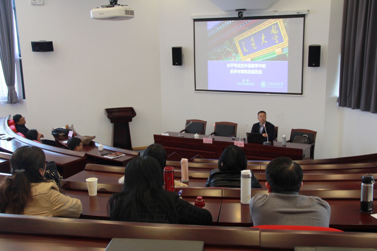 4月20日下午,语言文化学院邀请上海交通大学外国语学院常务副院长、博士生导师常辉教授来学院作了题为《水平考试在外语教学中的抓手作用和反驳效应》的专题讲座。本次讲座由语言文化学院副院长夏甘霖主持,语言文化学院全体教职工参加。