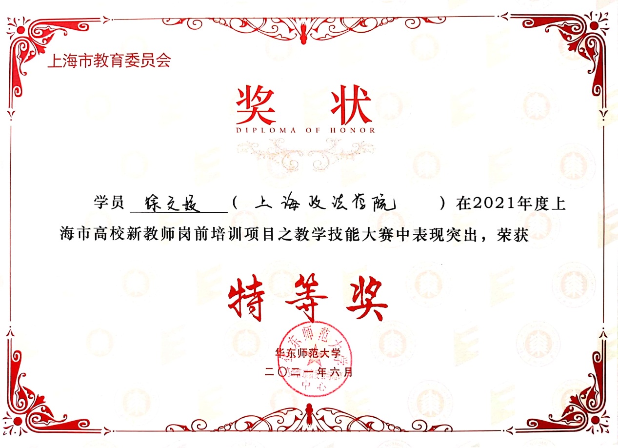 6月30日,上海市属高校新教师岗前培训(第16期)教学技能大赛暨结业典礼在华东师大国家大学科技园举行。教学技能大赛作为此次培训的收官验收环节,在17所院校371位参培新教师中选拔推荐了21位参加市属高校层面的角逐。经过参赛教师们的精彩展示和激烈比拼,我校语言文化学院青年教师徐文姣最终获得了“2021年度上海市高校新教师岗前培训教学技能大赛特等奖”。
