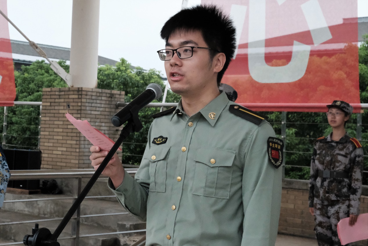 升旗仪式第四项是在语言文化学院2019级辅导员周占军的领誓下宣誓。同学们举起右拳,坚定地表达了自己对党的忠诚,也展现了在军事训练中不畏艰苦的精神面貌。