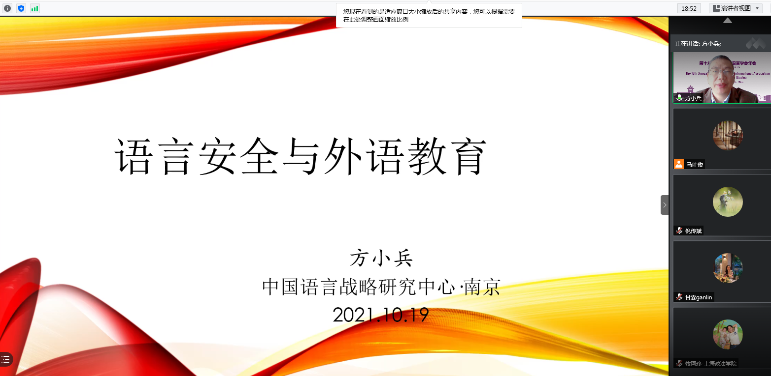 10月19日下午,语言文化学院举办语言文化讲坛第十五讲,邀请《中国语言战略》执行主编、南京晓庄学院外语教育政策研究所主任方小兵教授,为语言文化学院全体教师作了题为“语言安全与外语教育”的云端讲座,讲座由语言文化学院副院长夏甘霖主持。