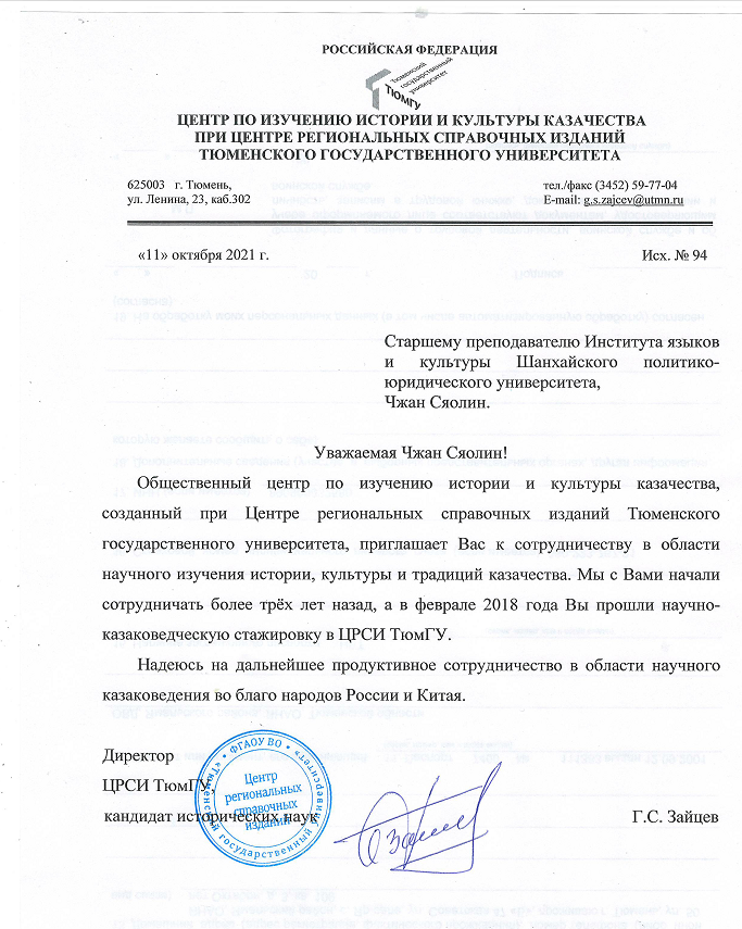 会议期间,该校哥萨克历史与文化研究中心主任扎伊采夫正式宣读了秋明国立大学给聘请我校张晓玲为中心兼职研究员的聘书,扎伊采夫在信中指出希望未来与张晓玲就哥萨克问题研究开展进一步学术领域的交流与合作。