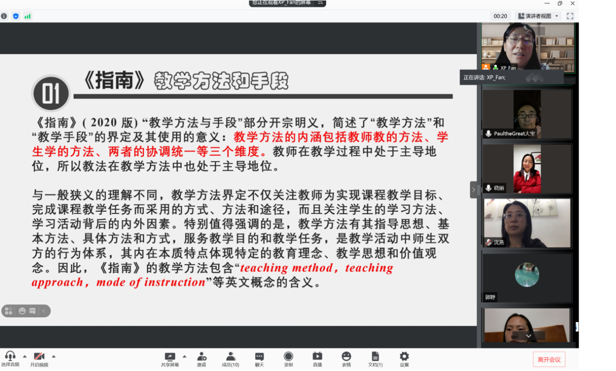 研讨会对2020年教育部高等学校大学外语教学指导委员会新修订的《大学英语教学指南》中“教学方法与手段”部分进行解读和说明,讨论了教学方法背后的外语教育教学理念、教学方法的科学使用与创新对教学效果和质量的影响、推进教学手段现代化对创建多元教学环境的要求、合理使用教学手段对培养学生自主学习能力和创新教学模式的意义。