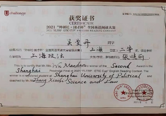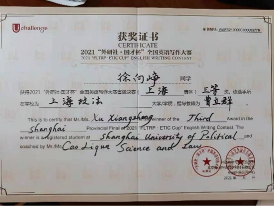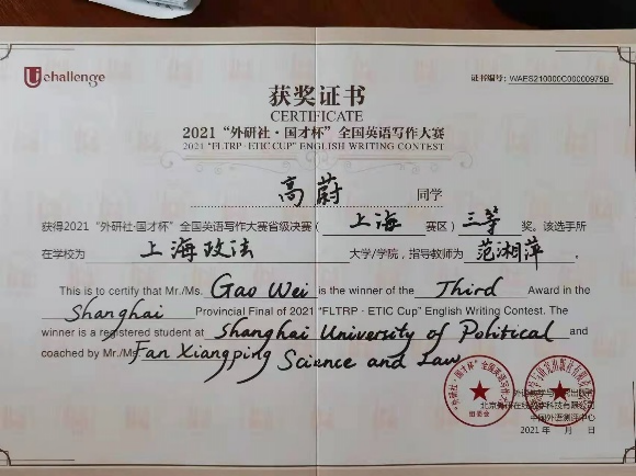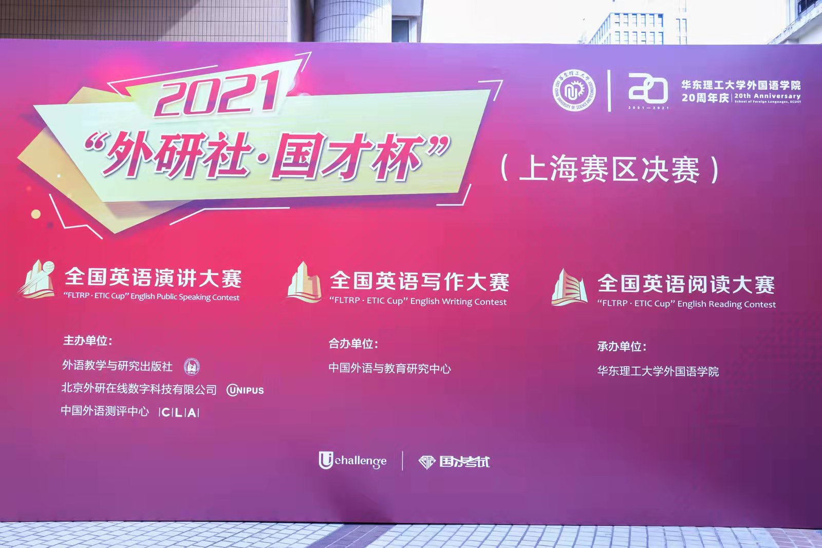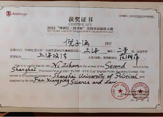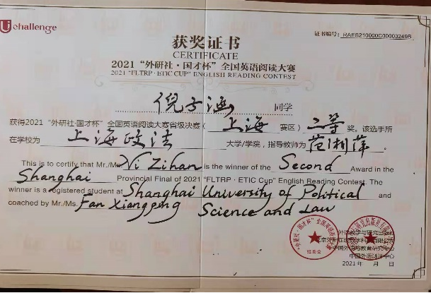 近日,2021年“外研社·国才杯”全国英语演讲、写作、阅读大赛上海市决赛成绩揭晓。经过激烈的校级初赛,来自上海30所高等院校的200多名优秀选手入围演讲、阅读、写作三项上海市决赛。我校学子不负众望,在三项比赛中均表现不俗,斩获阅读比赛二等奖2个(语言文化学院吴曼丹、经济法学院倪子涵),演讲比赛二等奖1个(经济法学院倪子涵),写作比赛二等奖1个(经济法学院倪子涵)、三等奖2个(国际法学院高蔚、经济管理学院徐向峥)。语言文化学院范湘萍老师、张晓丽老师、曹立群老师荣获“优秀指导老师”称号。