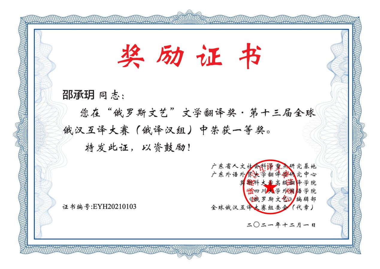 由广东省人文社科重点研究基地、广东外语外贸大学翻译学研究中心、莫斯科大学高级翻译学院、《俄罗斯文艺》编辑部(中)、《翻译理论》编辑部(俄)及四川大学联合主办的“‘俄罗斯文艺’文学翻译奖·第十三届全球俄汉互译大赛”评选结果近日揭晓,我校语言文化学院俄语专业19级邵承玥同学斩获一等奖,戚晶莹同学获得三等奖。