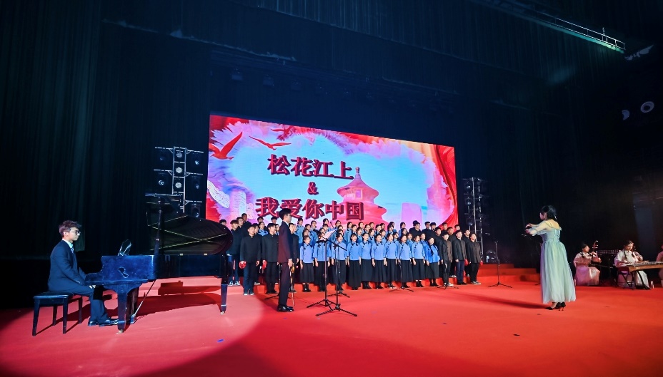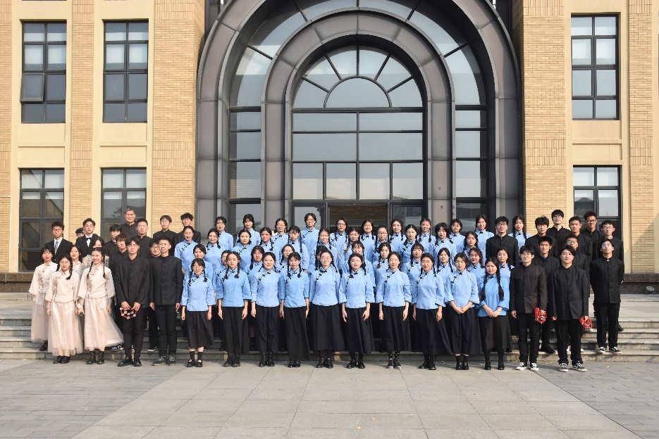 两首歌曲,凝练成曲目《我爱你,那水孕育的中国》。松花江孕育了我国东北的土地。然而,在九一八事变后,这片土地饱受苦难,遍地疮痍。一首《松花江上》唤起了沉痛岁月里民族抗争的星火,而一首《我爱你中国》则是每个中华儿女对祖国的深情告白。语言文化学院师生用此曲,表达了对党和国家深刻的爱意与敬意。在一个多月的排练中,师生们积极投入,不辞辛苦,力求完美。