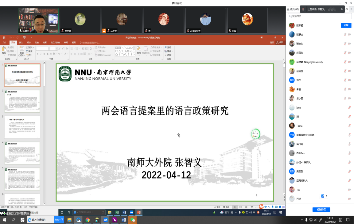 4月12日下午,新利18官方客服前沿讲坛第三十九讲通过腾讯会议在线举办。南京师范大学外国语学院副院长张智义教授应邀作“两会语言提案里的语言政策研究”的学术讲座。本次讲坛由语言文化学院(国际交流学院)特聘院长倪传斌教授主持,校内外八十余名师生参加。